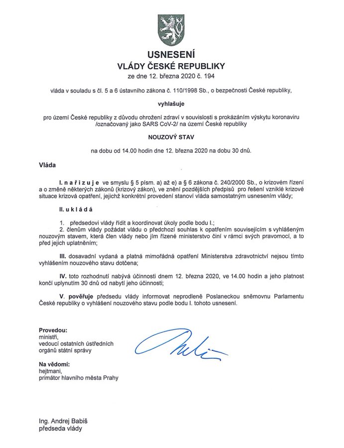 Usnesení vlády ČR o vyhlášení nouzového stavu