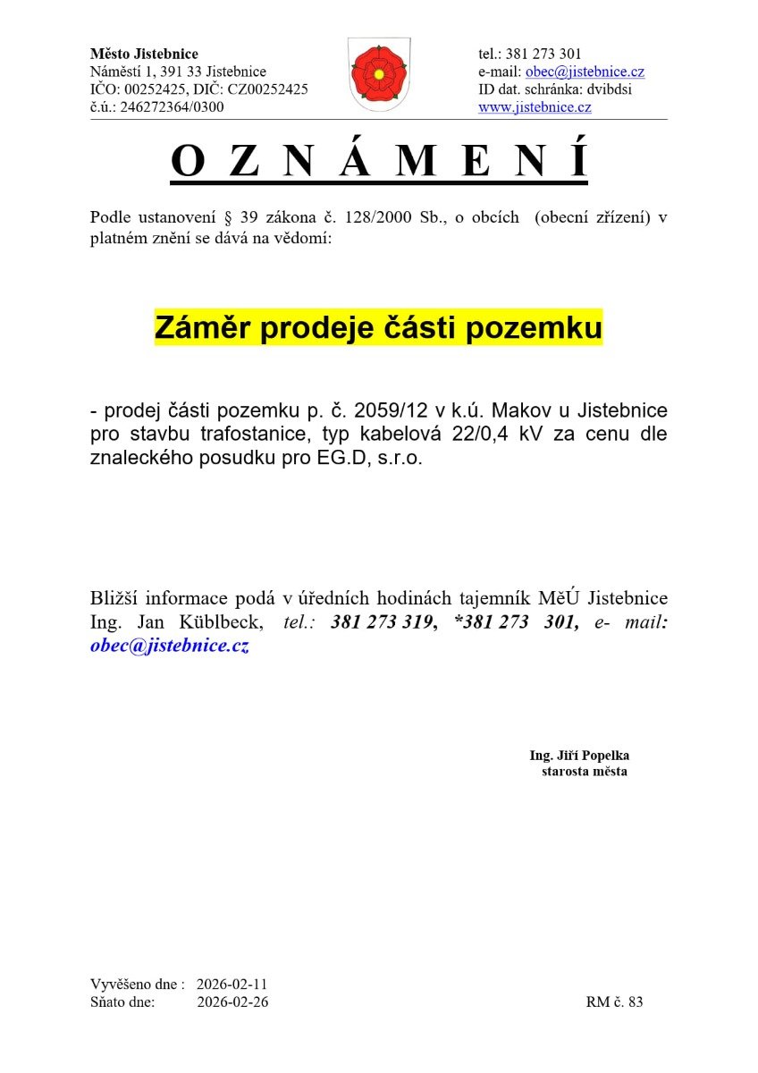 Záměr města Jistebnice - prodej pozemku v k.ú. Makov