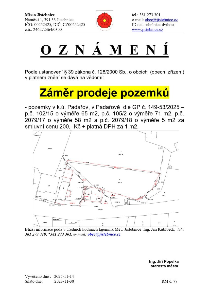 Záměr města Jistebnice - prodej pozemků v k.ú. Padařov v Padařově