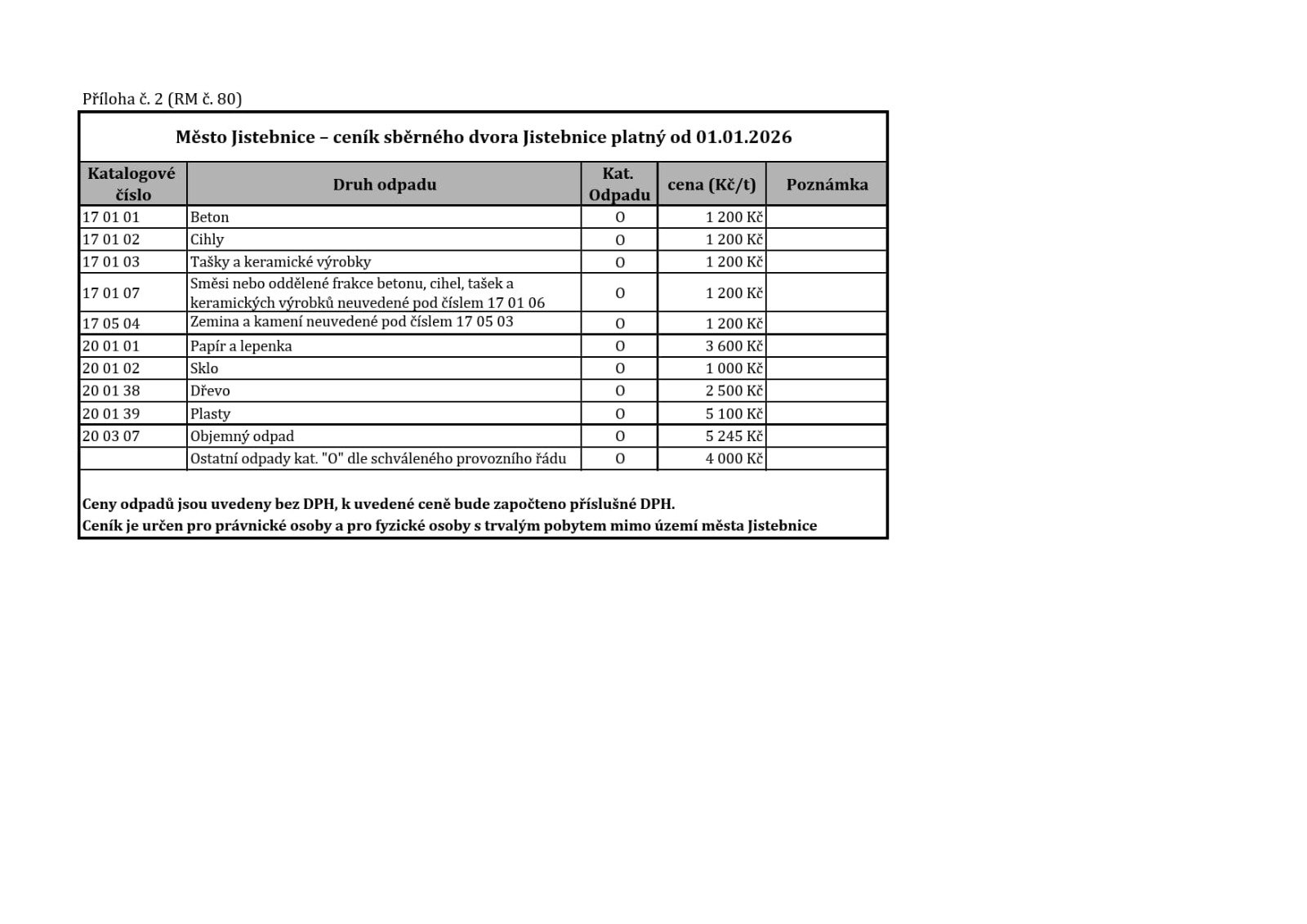 Ceník - Sběrný dvůr Jistebnice (separovaný odpad)